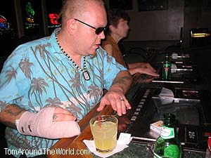 | I asked what it was and was told that it could detect trace amounts of plastic explosives. I was shocked. They were testing my cast to see if it would explode! I couldn't believe it. How dangerous can a guy with a Mohawk dressed in black shorts, a touristy blue Hawaiian shirt, and sandals look? These were the exact same guys that I had told seven minutes earlier that I was going out for a cigarette. They saw me come off of the other plane. They saw me in the terminal. They saw the cast as I past them on my way out What the Hell is wrong with these people? Did they really think that I flew into Indianapolis with a fake cast to meet up with some terrorist only to switch the cast for one made of explosives? IDIOTS! Sven was again sitting about twenty feet away and watched the whole thing. I shot him a look and he just shrugged It was bizarre. |