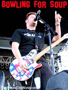 We introduced ourselves and got down to business. Sven readied the video camera and we got started with the interview. We had to keep the interview short because it was nearly time for them to go on stage. Jaret and I discussed the current tour and the popularity of the band's latest single "1985." We also talked about Bowling for Soup's plans for the future. The guys were all very friendly and fun to talk with. After the interview, Sven and I posed for a few photos with the band. We thanked them for their time, wished them a great show, and then found our way back out to meet up with Big Rob. He was waiting right where he said he would be. The band would be going on momentarily, so Sven and I had Rob hold our bags as we went up to take photos. We entered the photo area and one of the security guys told us we couldn't be there. I informed him that we were taking photos of Bowling for Soup and showed him my photo pass. He still said that we could not shoot. I was getting mad and told him, "We'll see about that " I went back to the band's bus and got the tour manager. I explained the problem and he came out to speak to the security guys. He told them that we were, in fact, allowed to take photos. Moments later, we walked right past the guy that held us up with smug looks on our faces. He didn't seem to like that too much, but there we were, standing in front of the stage with our cameras at the ready. Ha ha ha. We didn't have to wait long. About two minutes later, the local radio personality came out and introduced the band, and the crowd went nuts. |