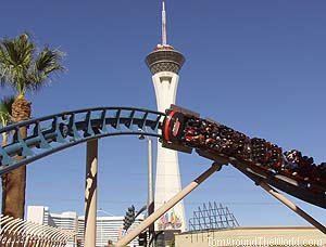 He said that instead, he would stand on the platform and video tape us as we left and returned from the ride. That idea sounded like a plan and we ran with it. I gave rob a quick lesson in the workings of the camera, and then we headed over to the ticket counter. Being early in the day (for Las Vegas anyway ), there were not a lot of people in line. Admission for the coaster was ten dollars, so we doled out the cash and got our ducats. We only had to wait for two turns to get the front car. I was ready! As we waited, we shot a quick video piece about the ride and realized that we only had about eight minutes of tape left. Rob filmed us getting into the car, strapping in, and listening to the standard recording that the ride plays. Then like a shot from a gun, we were gone. Speed: The Ride is not like the standard roller coaster in the fact that it doesn't take the car up a steep incline then release it to coast. Instead, Speed: The Ride uses a high-tech system of Electromagnetic Conduction System. Long electromagnets that alternately reverse polarity in rapid succession simultaneously push and pull the coaster forward. |