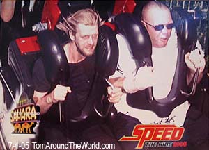 It accelerates riders from zero to seventy miles per hour in less than four seconds. The take off was intense and pulled us to the back of our seats. We rushed out the end of a short tunnel, up a slight inclining turn, down a short drop and then up and around through a giant loop. As we cleared the loop and the car righted itself with the horizon, we could see for a few seconds what was coming next. It was like something from a rollercoaster fan's worst nightmare... The track in front of us took a few more twists before turning nearly ninety degree turn straight upwards like one of those Hot Wheels ® Tracks that go up the wall. As we were turned skyward the track went straight up for nearly two hundred feet and then seemed to run out I mean it, the track just ended! The coaster shot right up the track towards an apparent certain doom! Just as we thought it looked like we would fly off the end, gravity caught up to the cars, pulling them backward. Sven and I experienced some cool negative G's and become weightless for a second or two. The coaster came back down, across another series of magnets, accelerated again, and shot us back through the loop in Reverse! Seconds later the coaster screeched to a halt in exactly the same spot we started from. The whole ride had taken about a minute and a half. I was flying from the mushrooms and jacked on adrenaline. I let out a "Whoo-hoo!" ala Homer Simpson and then turned to the camera. I yelled out, "Yo, Rob! That shit was faster than your sister on Prom Night!" The timing was perfect. |