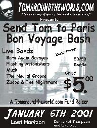 | It will come in handy on the trip. Phil Rubenstien dropped it off in person. After finishing work at United Radio I went home, took a shower and headed to work at MacGregor's. I passed out a lot more handouts about the show. Everyone kept asking why I was working on my birthday and I told them "because I need the cash." A lot of the regular customers bought me drinks and shots. It was a lot of fun and by the time I left to go home I left I had a pretty good buzz going on. Thirty-two doesn't seem all that bad. I don't feel much differently than I did when I was a young pup of eighteen. (A bit more cynical, maybe, but not much else.) January 4, 2001 Today I picked up the XXL and XXXL t-shirts from Multi Image Inc. I also got my shop jacket back. Chuck Westfall screened the t-shirt design on it's back and it looks absolutely awesome. Many people commented on it as I wore it around for the rest of the day. January 5, 2001 The Syracuse Post-Standard ran a cool article today about the upcoming Bon Voyage Bash. Mark Bialczak did a great job and even gave me the Headline! Thousands of people read the Weekend section and will see the story. I was really HAPPY today. The show is tomorrow and all is in readiness. The 4,000 handouts are all gone. I hope a lot of people show up. |