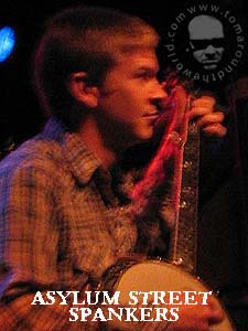 Scott Marcus: (Drums) Raised on Classic Rock, Scott taught himself the drums and guitar at age thirteen. At nineteen, he left New York City for Austin, TX, where he formed the revered and influential band Glass Eye. For a decade Glass Eye toured and built up a devoted cult following. In 1994 he joined the heavy rock trio Starfish and toured with them until 1998. Eager to return to life on the road, Scott joined the Spankers in 2003. Sick: (Vocals/Violin/Mandolin/Guitar) The youngest Spanker of the current line-up, this Rochester, NY native has been classically trained since childhood. Sick's teen years were spent playing Heavy Metal and Jazz. Once on his own, he moved to New Orleans, LA, busking for tourists and honing his distinctive Punk-infused style. His quest for collaborators led him through several Punk and Bluegrass bands before joining the Spankers in 2004. Charlie Rose: (Vocals/Banjo/Mandolin/Guitar) Charlie comes from a musical family and began seriously studying Jazz guitar at age twelve. He played in his high school Jazz band and then studied music theory. At a bluegrass festival he discovered his passion and soon began playing mandolin and banjo. In Lawrence, Kansas he led the group Two Dollar Shoe until college graduation. He then moved to Colorado and played with anyone he could until he sat in with the Spankers, who invited him to join in 2004. Ok, so now you are up to speed on the band and its members and I can continue the story. Before beginning the show, Wammo asked the crowd to refrain from loud or drunken conversation during the performance and suggested that we save it for the after party in his van. He also encouraged us to join in on the sing-along songs and to go absolutely bonkers between songs. With that the Spankers began their set. The sounds of the Asylum Street Spankers soon filled the club. The band's brand of musical lunacy is unparalleled. The band was using a small amount of amplification, which is usually a no-no with this band. Generally, the Spankers play with no electric amplification, but in larger clubs it becomes necessary, just so the band can be heard over the crowd. |