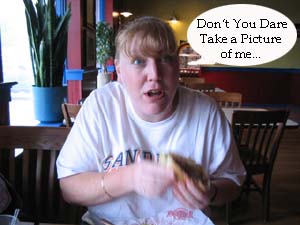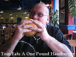 Not since I lived in Louisiana and the Many High School Tigers Football team went to State Championships. (I almost got to go to one in Arizona on my trip to Mexico, but the person I was with didn't want to go.) So, to see one in Boston got me all worked up. My sister saw my obvious excitement and we stopped at Fuddruckers to eat. I ordered a One-pound Burger with a side of fries. Barb, on the other hand, went with the wimpy 1/3-pound burger. When our food came, I couldn't believe my eyes. My burger was HUGE! I practically had to unhinge my jaw like a snake to eat it. Barbie took a few photos of me trying to eat it, but I wasn't allowed to take any of her. She threatened my life if I did. I finished the burger, but was so stuffed I could hardly move, and I didn't finish my fries. |