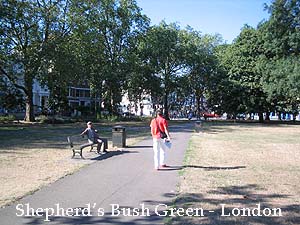 After reading the list of upcoming concerts and looking around at the Empire, I decided to take a stroll through area's main focal point: Shepherd's Bush Green (or Shepherd's Bush Common). It is an approximately 8-acre triangular area of open grass surrounded by trees and roads lined with shops. The park has two tennis courts at its northwestern apex. There was also a play area for kids with a sandbox, a small slide, and a little jungle gym. It was all very nice. |