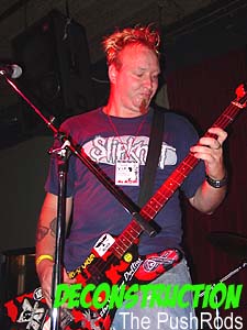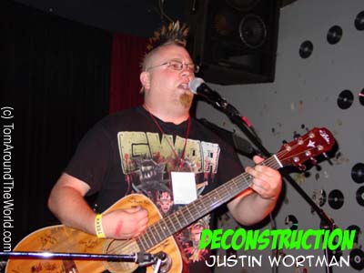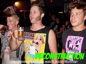 About midway through the group's performance, Calhoun's bass broke. While Calhoun and his girlfriend fixed the instrument, Silas Sleaze encouraged The Grimli and Botard to keep up a surf riff. Meanwhile, Sleaze regaled the audience with a poetic tale of a life gone tragically bad. The audience was drunkenly enthralled.