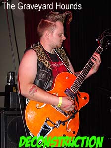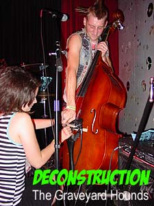 Finally, the witching hour of midnight arrived and Syracuse's own psychobilly punks The Graveyard Hounds began their set. The Hounds consist of Silas Sleaze on wailing laments, Mohawk Calhoun on the big stand-up bass, Renob Botard on the drums, and a mysterious figure known only as The Grimli on what he refers to as The Devil's Six-string. Due to a recent injury where he cut off several of his toes, drummer Renob Botard was unable to perform with the group for the evening and in his place was Dr. Revel Thrashenstien.