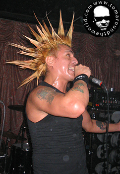 We arrived at Cafe Metropolis to find a long line stretching all the way down the block. There were a ton of people there to see the show. The Casualties drew a mixed crowd. Many young punks, a bunch of old schoolers, and even a few Hammer Skins. I bumped into this girl, Brenna Hell, that I had met last time I was in WIlkes-Barre and she looked GREAT. She had cut her hair into a Mohawk and did it ever look good! We chatted for a few minutes and then Walter and I walked into the club, got banded and went to find The Casualties. It wasn't hard to find them. Jorge's hair stands out in a crowd. He was sitting by the merchandise booth talking with a few guys about some old shows in Philly. I walked up and introduced myself and inquired to the whereabouts of Jake. From what I got out of the conversation was that Jake's aunt owns an Italian restaraunt somewhere in the area and I was told that Jake had gone to get food. So, Walter and I made ourselves comfortable and waited for the show. Twenty minutes later, the doors opened and the crowd flooded into the small room at Cafe Metropolis. |