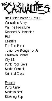 The Casualties formed in 1990 out of a desire to return to the heyday of punk. During the band's history there have been many line-up changes. The only founding member left is Singer: Jorge. Guitarist Jake came aboard in 1993, Drummer: Meggers (Formerly of The Rivits) in 1995, and Bassist: Rick (Formerly of Manix) in 1999. This current line-up has remained stable ever since. The band has built a HUGE following. The have been one of the Headline acts on the Warped Tour and toured with some of the biggest names in Punk rock. The crowd made one final push towards the stage and it was on! The Casualties took the stage. After the first song, Jake had a guitar problem and his sound cut out completely. As Jake and the tech worked on getting the rig going, Jorge, Meggers, and Rick fooled around and entertained the crowd. Jorge did an a cappella version of "Le Coocaracha" and then they broke into a small bit of Iron Maiden and a few other well known songs. It was all pretty funny. Then Jorge asked for some jokes. Being in the front near the stage I couldn't resist. I grabbed the mic and gave one of my sickest jokes and the crowd loved it. A few other people shouted out jokes and the rest of the crowd called out song requests. It took Jake and the tech guy about five minutes to get evertyhing working correctly again. When they were finished, the band launched back into their set and all Hell broke loose. The previous insanity was nothing compared to what the crowd did now. There were stage-divers and crowd-surfers were everywhere. The crowd moved and shifted with the moshpit and it was like being in the ocean during a hurricane. At one point, a stagediver leaped from the stage and caught his arm on a buckle or spike, (or something) on somebody's jacket and gashed his arm all up. A few minutes later he was outside in an ambulance. |