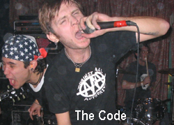 | The next band was The Code. They are from Pittsburgh, PA. Formed in 2000 out of an intense love for punk music and many deeply shared ideals, the 5-piece band consists of Marcdefiant on Vocals, Little Roger and Beau on Guitars, Andrew on Bass, and Seth on Drums. The band is touring in support of their latest CD Rhetoric of Reason which was released on Jumpstart Records. The Code's music is an impressive collage of hard-nosed in-your-face punk rock and ska that could be compared to Operation Ivy in sound, intertwined with positive politically and socially conscious messages. Serious as they may be in their causes and ideals, The Code doesnt forget the importance of having a good time, something youre guaranteed at their live shows. It is some of the most intense and energetic punk rock around. The Code rocked out to such songs as "Know Your Enemy", "In Hope", and "Alert. Aware. Involved." The crowd was clearly liking what they were hearing and the stage divers were insane. I must have been kicked in the head about four times. It was all I could do to keep a grip on my camera and keep it from getting smashed to the floor. The Code put on a fantastic set and it was easy to see why this band is becoming very popular. Check out their website at www.theecode.com It is very modern looking with several mp3's and lots of photos. |
