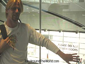 We checked out a bunch of the shops, including The Motown Store. They carried all sorts of Motown paraphernalia with records on them and more. The thing that caught my eye was the Penny Cruncher. I love crushed pennies, and have been collecting them for some time. If you have never seen what I am talking, about a brief explanation is in order. The machine is about the size of a newspaper box with a big crank handle on the front. The handle is attached to a big wheel inside that turns. On the front of the wheel there are up to four picture designs with an arrow to line them up. You choose your design, then put two quarters and a penny into the slider. After pushing the slider in, the penny falls into place and you turn the crank. The wheel spins around exerting about twenty tons of pressure on the coin and the design you chose gets imprinted on the crushed penny. (It's like putting a penny on a railroad track, except you get a neat picture on it.) I got two pennies, one from Detroit Airport and one that says Motown. After that we decided to eat. There was a food court and we chose to eat at Burger King. It was the quickest and cheapest way to go. After our meal, we hopped the elevated Tram that ran the length of the airport to our gate. There were signs on the glass all around the Tram area that read "Do Not Touch Doors." Being the jokers that we are, Sven and I couldn't resist. We stood right next to the signs and Sven put his dirty fingers all over the glass as I laughed and snapped photos. Soon, we were on the next leg of our journey. |