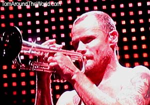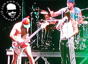 Tours with the Foo Fighters and Pearl Jam brought them through the year 2000 without problems.The Peppers holed up in the studio in November of 2001. By the summer of 2002 they had a new album ready to drop entitled By the Way. The following tours were well-received by the bands fans and it was easy to see and hear why. The Red Hot Chili Peppers performance was nothing short of Rock & Roll perfection. From their opening notes to the closing, the band shredded their way through what was practically a Greatest Hits show. Anthony Kiedis sang his ass off as Flea ran and jumped around the stage wearing only his underwear and a propeller beanie. At one point after they first took the stage, Flea gave a shout out to the Live 8 concert and asked that we all do a small part and make donation as well. Then it was back to the music. Anthony Kiedis is not one to spend a lot of time talking between songs, so the show moved right along from one song to the next. The light show and stage sets were great. Near the end of the set, Flea pulled out his trumpet and wailed. The crowd loved it! Soon, the show was over and the incredible fireworks display began. The show cost fifty thousand dollars! |