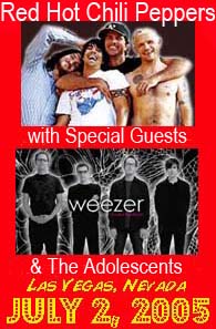 The Red Hot Chili Peppers are one of the most respected bands in Rock with good reason. They are known worldwide. They have platinum albums. And they just plain ROCK! Up to the date of this show, it was The Chili Peppers' only listed show for the year. I hadn't seen the Peppers live since Woodstock '99. That show was literally a riot. This show would be just as intense. If you are going to have the Peppers play, you need an opening band that can rip it up as well. Las Vegas knows how to put on a show and got Weezer, currently one of the most popular bands in America. Every show on Weezer's tour is SOLD OUT... including this one for 100th Anniversary of Las Vegas! From their popular "Undone (The Sweater Song)" and the catchy "Buddy Holly" to the newest hit "Hollywood Hills" Weezer has a knack for writing cool songs that really hook you in. I had never seen Weezer play before and was looking forward to this performance. With the exception of the global Live 8 concert, this show promised to be the HOTTEST party in America! We arrived at the show and got in line enter. There was no shade and we had to wait for a while. We could hear a band beginning to play inside, but could not distinguish who it was. After we got inside we found out that The Adolescents were the opening act. I went ballistic! I wish we had known that they would be the special guests. We would have gotten to the venue much earlier. I love The Adolescents and had not seen them since the Inland Invasion II concert with the Sex Pistols. |