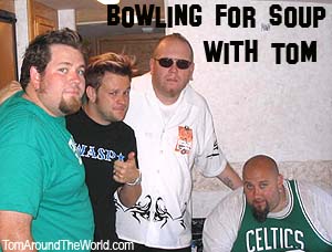 We introduced ourselves and got down to business. Sven readied the video camera and we got started with the interview. We had to keep the interview short because it was nearly time for them to go on stage. Jaret and I discussed the current tour and the popularity of the band's latest single "1985." We also talked about Bowling for Soup's plans for the future. The guys were all very friendly and fun to talk with. After the interview, Sven and I posed for a few photos with the band. We thanked them for their time, wished them a great show, and then found our way back out to meet up with Big Rob. He was waiting right where he said he would be. The band would be going on momentarily, so Sven and I had Rob hold our bags as we went up to take photos. We entered the photo area and one of the security guys told us we couldn't be there. I informed him that we were taking photos of Bowling for Soup and showed him my photo pass. He still said that we could not shoot. I was getting mad and told him, "We'll see about that " I went back to the band's bus and got the tour manager. I explained the problem and he came out to speak to the security guys. He told them that we were, in fact, allowed to take photos. Moments later, we walked right past the guy that held us up with smug looks on our faces. He didn't seem to like that too much, but there we were, standing in front of the stage with our cameras at the ready. Ha ha ha. We didn't have to wait long. About two minutes later, the local radio personality came out and introduced the band, and the crowd went nuts. |