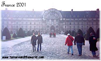 | January 17, 2001 It was foggy and somewhat warm. We got up and prepared for our last day in Paris. We had coffee and baguettes at the hostel and set off on the shotgun tour of Paris.First, we all went to the Musée de L'Armee (the Army Museum). We saw swords and armor from all different countries and ages. My favorites were an ancient Roman sword that was beautiful and the display of ancient Chinese armor. We saw wonderful cannons that were covered with bas-reliefs. We took a photo of Pete looking like he was being shot out of one them with me lighting the fuse. |