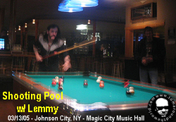 I finished the interview with Joe Altier, thanked him for everything, and headed back into the club. Lemmy was hanging out with Phil by the pool table. I walked over and introduced myself. He was very soft spoken and friendly. I told him that it was an Honor to meet him again. I asked if he would mind posing for a photo and he was totally down with it. So we struck a pose and snap, the moment was frozen forever. I also took a photo of Lemmy with my friend Trinity Blunt who had accompanied me on this trip. She was very excited. I spoke with Lemmy for a few moments and told him about my HeroQuest Campaign. I also informed him that I had tried to set up an interview, but was denied by the PR people. Lemmy told me to find him after the show and we could perhaps sit down for a few moments and have a short impromptu interview session. After that, Lemmy was up in the pool game against Phil. Trinity and I chose a seat near the pool table and watched the game. We called out "Good Shot!" every time either of them had one. I snapped off a few photos of Lemmy and Phil's game. They aren't the greatest photos, but it's obviously Lemmy shooting pool. So, we hung out and watched the guys playing pool and chatted with them for a while longer. I shot a game with Lemmy, and he kicked my ass! Afterwards, I shook his hand, thanked him, and then went outside to smoke a cigarette. |