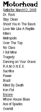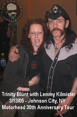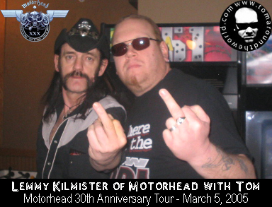 | Their first album for the label was 1994's Bastards. For the remainder of the '90s, Motörhead concentrated on touring more than recording. Lemmy appeared in insurance commercials in Britain. He also acted in the horror film Hellraiser 3 and had a cameo in the porno flick John Wayne Bobbit Uncut. The year 2005 marks the 30th Anniversary of Motörhead and Lemmy, Phil, and Mikkey are still out on the road touring and playing for their dedicated fans. The current tour brought them to Binghamton, NY and the Magic City Music Hall which is owned by Stu Green, formerly of Magic City Productions. Stu Green is the guy responsible for bringing some of the biggest bands in the history of Rock & Roll to the Central New York area. With this club, he continues to do so. The club is large and the stage is good sized. I estimate it would hold about 700 to 1000 people for shows. The walls are covered in autographed 8 x10 glossy pictures of nearly every band you can name. There is one wall that is completely covered with concert tickets. Behind the bar are many autographed guitars. It is a true Rock & Roll Music Hall in every sense of the word. They also serve food. I had the nachos and I will tell you they were great! My Goal for the day was to interview Brand New Sin frontman: Joe Altier, who happens to be a friend of mine. Brand New Sin are from Syracuse, NY and I was there to do an article on how the hometown boys are doing great. So, I found Joe and because it was loud in the club due to soundchecks, we went out to the band's van to do the interview where it would be quiet. Brand New Sin have toured with Motörhead in the past and they know the guys in the band. So, after the interview was done, I asked Joe if he would introduce me to Lemmy when we went back inside. He told me that Lemmy was very approachable and to go up to him and say hi. (In truth, I knew this because many years ago I met Lemmy for a hot minute at The Lost Horizon in Syracuse when Motörhead played there. Lemmy and I talked about music and I told him about my band Born Again Savages. I have an autograph that I got from him on that day that says: "Open for us someday!") |